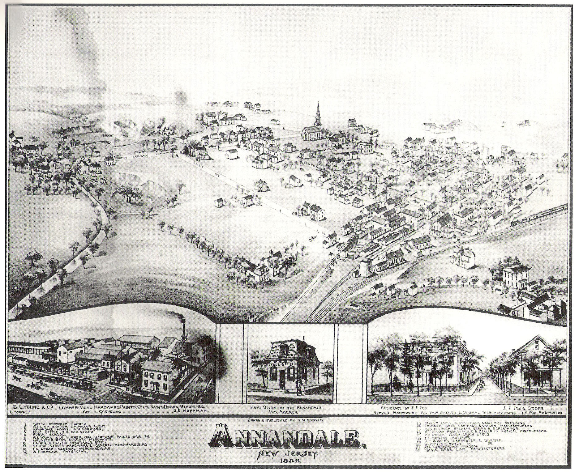 Jacob Young, a merchant, and James Kenna and Thomas Kinney, railroad employees. Boeman, who acquired a .43-acre parcel from the heirs of Peter Young in July, 1852, is credited with the purchase of the first village lot. He erected a tavern on the lot which survives today as the former Annandale Hotel (#98). The store/residence next door (#97) was evidently built shortly thereafter. The property was purchased by Jacob S. Young and Jacob P. Finley in 1853, and a deed for its sale in the following year describes it as "the lot and premises now occupied by Young and Finley with their dry goods store." George M. Frech, who was appointed railroad agent, lived in the passenger station which was erected in 1852. A post office was established in 1859 with merchant Theodore H. Risler as first postmaster. The 1860 Clinton Township farm map indicates that, in addition to the station, hotel, and store, the nascent community had acquired a lumber yard and hardware store (#91), a grain warehouse, and about a dozen dwellings clustered along the road to the station (Main Street) and the turnpike. By that year Centre Street also had been opened, but the new street and West Street remained undeveloped, except for an earlier farmhouse (#82) on the latter road. Growth quickened in the following decade, as building lots were subdivided along Main, West, and Centre Streets and residential, commercial, institutional, and industrial development occurred. Over forty houses were built between 1860 and 1873, including a number of quite substantial dwellings on Main and West Streets and two more modest houses on East Street which was opened by 1871. Two new stores were erected in 1870 and 1873 (the first, #16, a general store, and the second, '84, a tobacco and cigar shop), and a number of artisans, including two blacksmiths, two shoe makers, and a carpet weaver, established shops. A frame 3-story public hall with a seating capacity of about 250 was built on Main Street in 1865; it became the property of the local school district four years later, replacing the school house on the turnpike corner, but continued o be used by fraternal organizations and for public meetings and social events. A Reformed Protestant Dutch congregation was organized in 1866 and erected its substantial church (#68) in 1868. An 1869 newspaper advertisement indicates that there was a brick kiln at Clinton Station at that time. and the 1873 county atlas depicts three limestone quarry/kiln operations along Beaver Brook. By 1871, the year that the community was renamed Annandale, a planning mill which made "window frames, doors, sashes, Section Number 8 Page 4 blinds. and moldings" was operating in conjunction with the lumber yard, and by the following year the village had acquired a small carriage works and a cheese factory (#147). The former, developed in conjunction with a blacksmith shop on West Street, no doubt served a primarily local clientele; the latter, established by Julius Wettstein, who advertized in the 1873 county atlas "as the producer of the Celebrated French Cream Cheese..... Bondons de Newfchatel, Fromage de bois, Camemberts, etc." presumably had a wider market. Although it never surpassed Clinton, Annandale continued to grow modestly in the 1880s and 1890s. The importance of tfie railroad to local agricultural and business interests and the community's prominent role as a local shipping center at that time is clear from the 1881 county history which noted that Lime-kilns in the vicinity supply the country round about and furnish