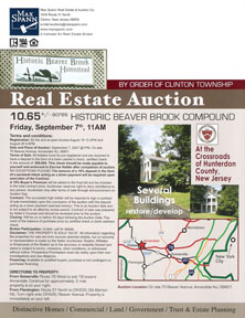 brochure pages above for larger images Link - Beaver Brook Non-Condemnation Redevelopment Plan - Dec. 21, 2015 Link - Beaver Brook Area in Need of Redevelopment Study - Nov. 2, 2015 Beaver Brook was originally developed around 1760 when Thomas Jones bought the farm from the West Jersey Society, a real estate group that sold land to settlers. During the Revolution, Mr. Jones served as a captain in the Hunterdon County Militia of the Continental Army. Local legend credits him with helping to round up the boats George Washington used to cross the Delaware in 1776. The last working farmer to own the property was John Cregar (Creager), one of the township's founding fathers, who called the property "Homestead Farm." New York stockbroker William Savin purchased the farm in 1906 as a weekend vacation home. He remolded the main house giving it it's current look and footprint and built a tenant house for his farm manager. Savin named the farm "Beaver Brook Farm." In 1933 Savin sold it to Roy B. White, President of the Central Railroad of New Jersey in 1926 and the one-time chairman of Western Union from 1933-1941. Much of the color scheme and wallpaper remain. White sold the property to Richard and Isabel Austin in 1941. Austin was a Montclair, NJ engineer who became familiar with the Annandale area in 1928 when his firm consulted on the design of the proposed overpass and interchange for the highways now known as Routes 22 and 31. The small portion of the property wiith all the historic buildings was purchased by Clinton Township in 1989. It's two former names were combined to become Beaver Brook Homestead. In September 2007, Clinton Township sold Beaver Brook to an Engineering firm. A previous attemp by the township to sell Beaver Brook yielded no bids. The Engineering firm plans a mixed use setting including a restaurant. In addition to the main building the property includes three barns, an ice house and laundry shed. |